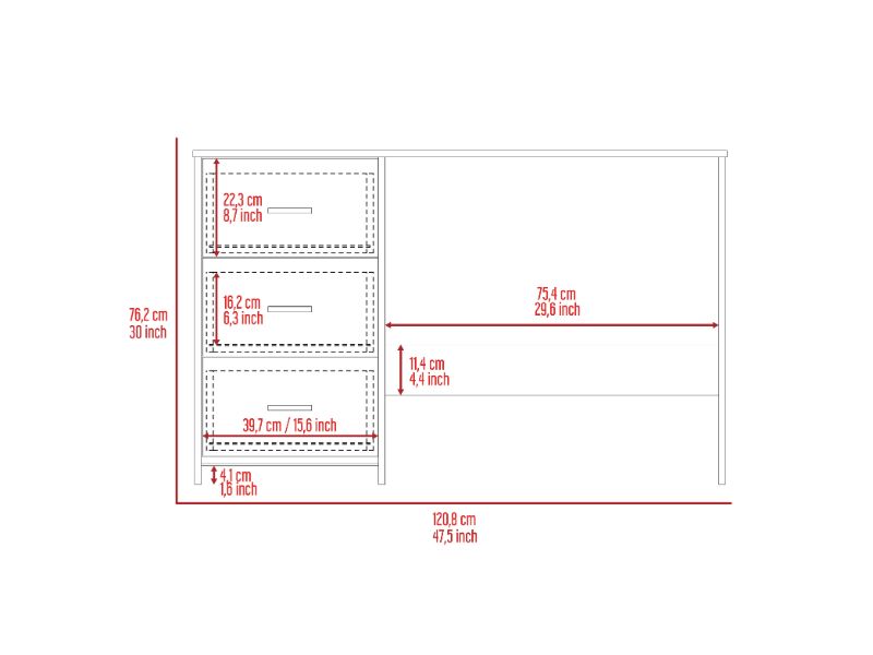 - Three Drawers: Full – extension drawers with smooth glide mechanisms for easy access