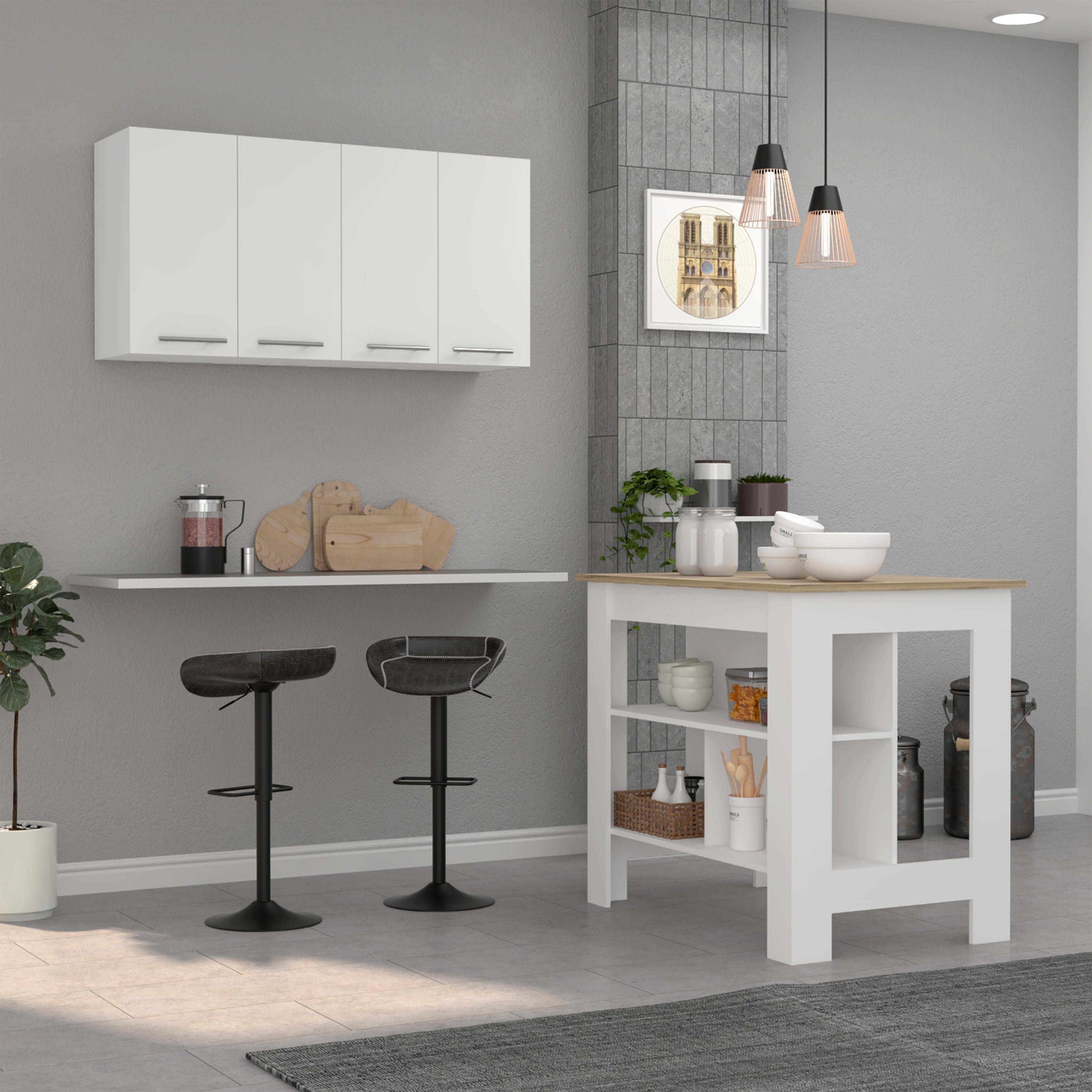 - Open Shelves: Three main open storage areas for organized storage