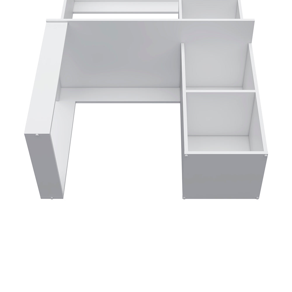 - Integrated Shelving: Top open shelf, two small open shelves above the main desk, and two larger open shelves below