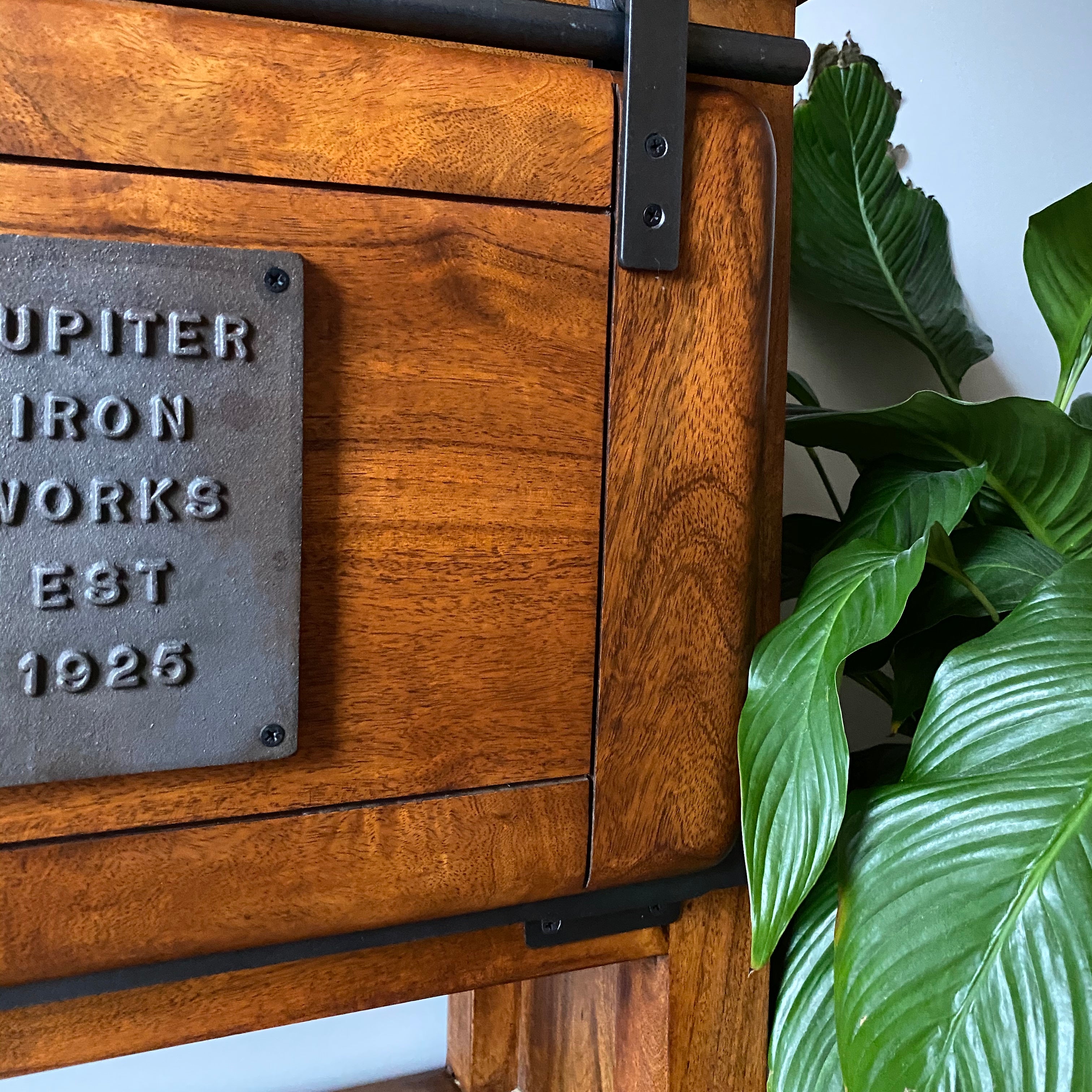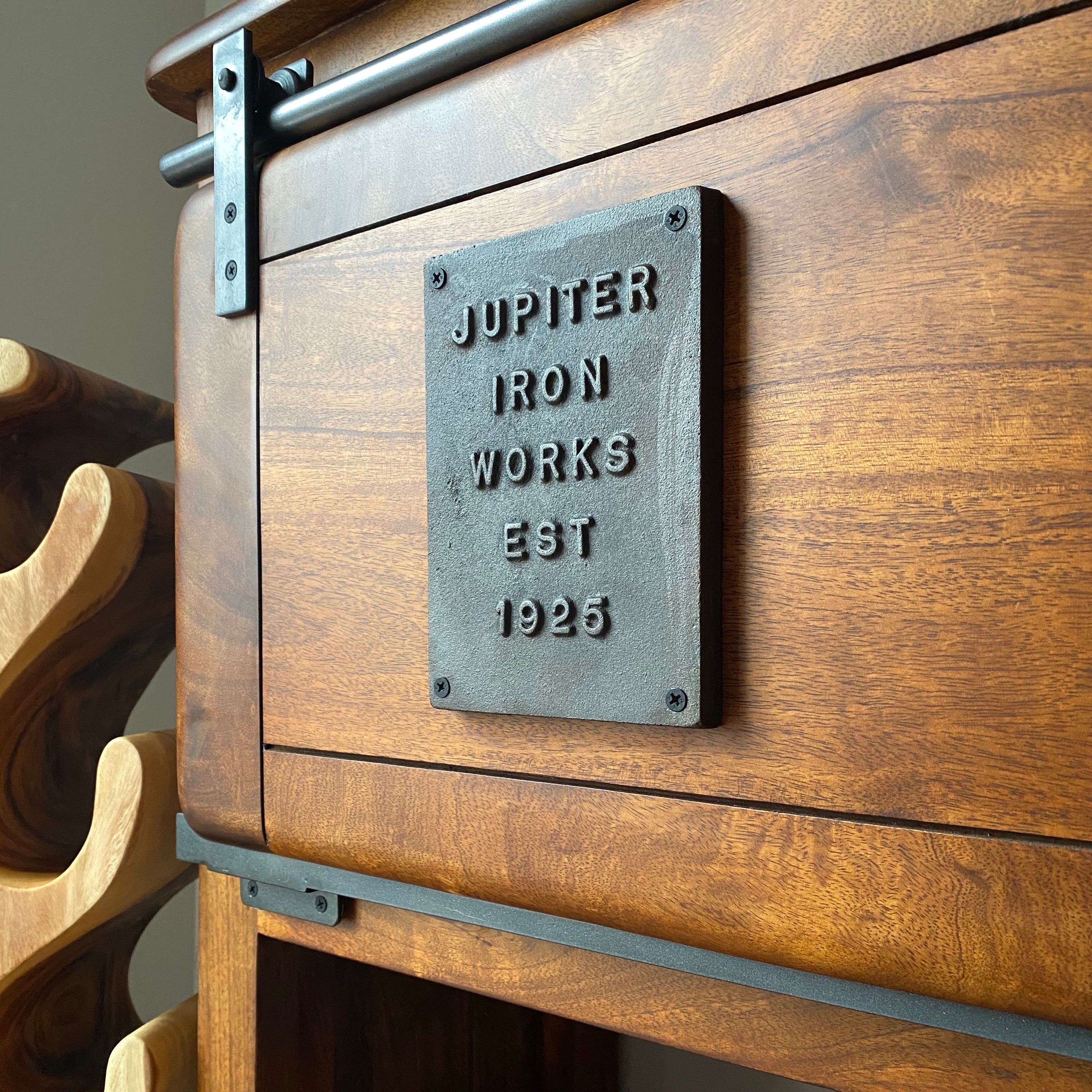 | Design Elements | Rounded wooden top edge, horizontal black metal rail, embossed metal plaque with “EST 1925”, smooth polished wood finish with visible grain |