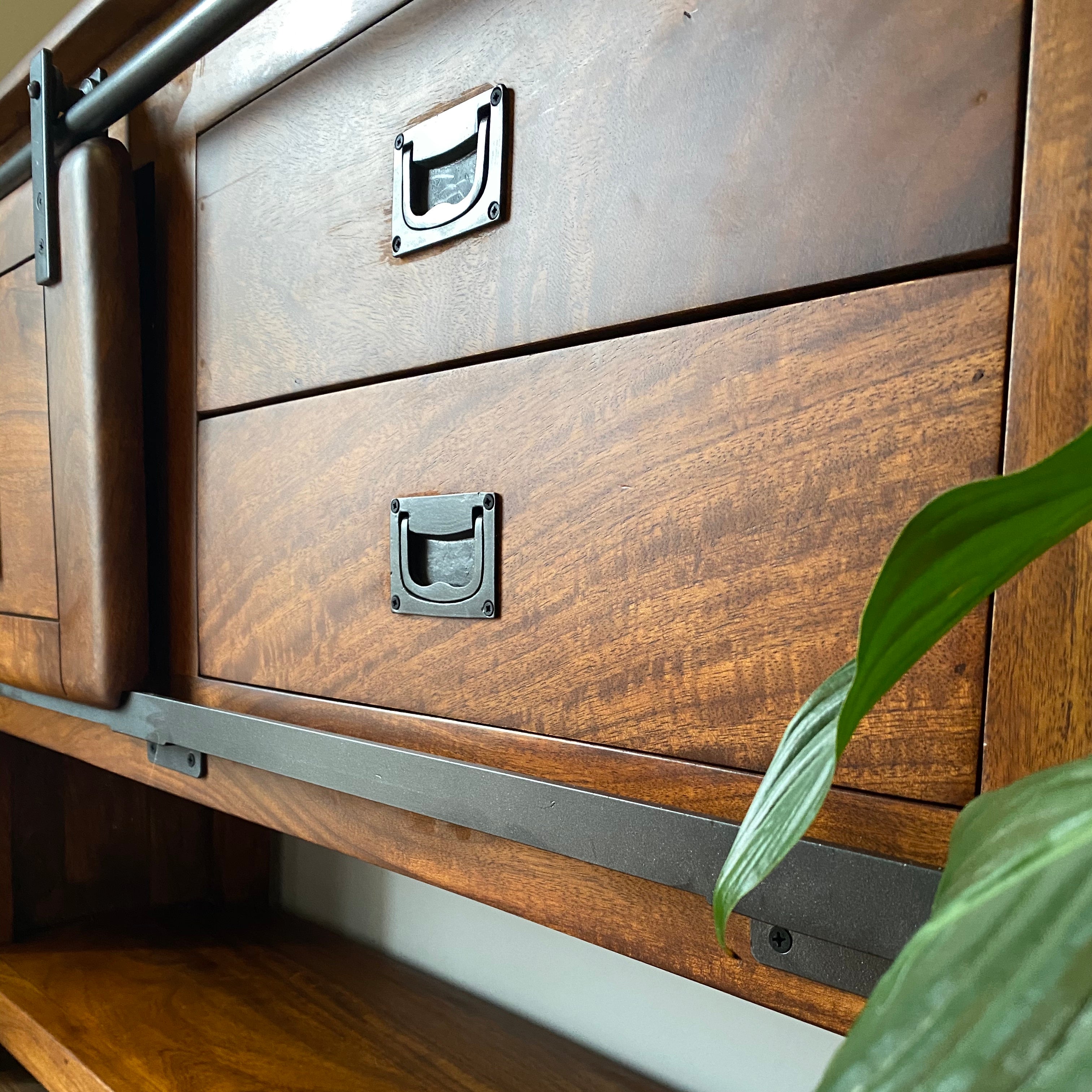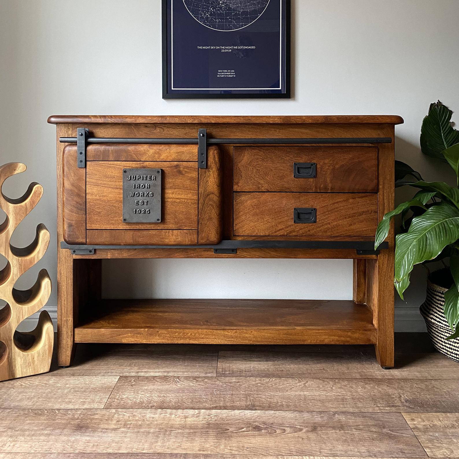 | Product Type | Storage cabinet/sideboard with rustic – industrial aesthetic for home use (living room, entryway), can be used as console or media cabinet |
