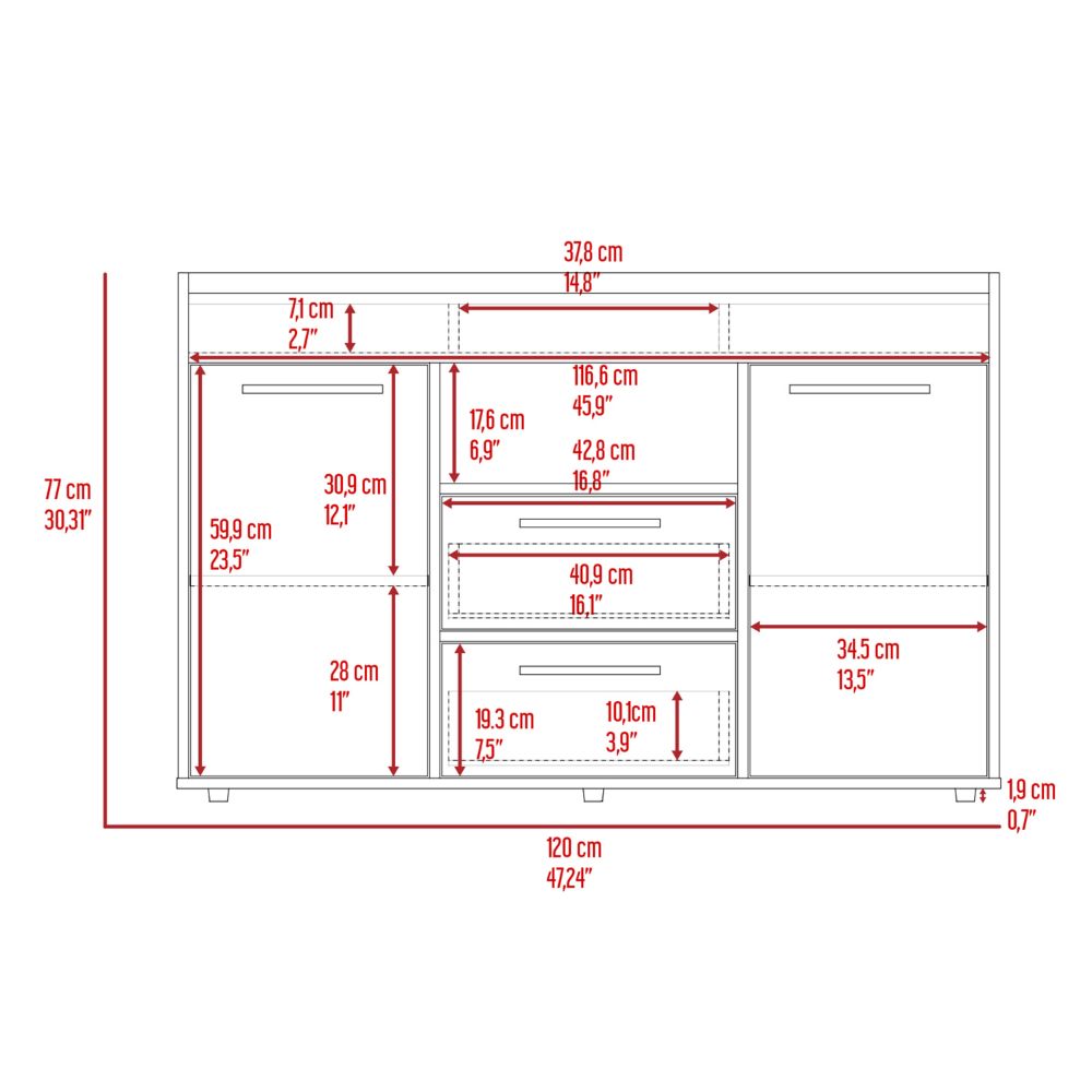 - Drawers: Two large, fully extending drawers with black horizontal handles