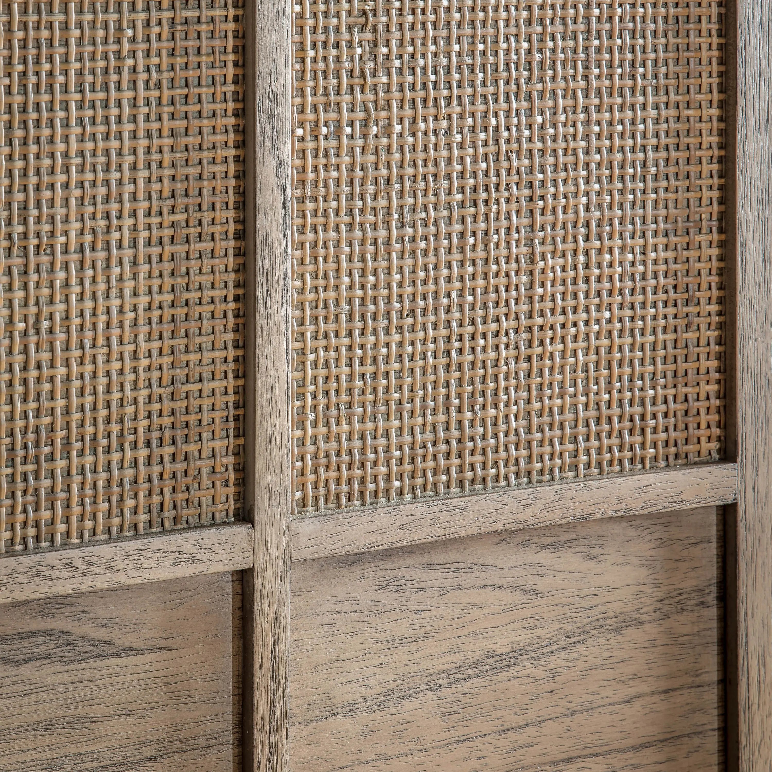 | Colors | Dominant light wood tones (gray undertones) with warm, natural browns from the woven panels, dark metallic hardware for contrast |