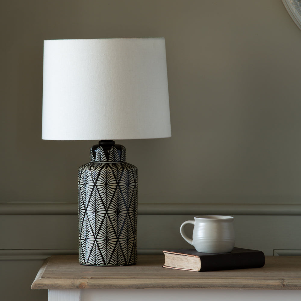 This table lamp is a perfect blend of style and functionality. It features a decorative ceramic base with a unique black – and – white geometric pattern and a classic cylindrical fabric lampshade. It can enhance the interior design of any space while providing soft, ambient lighting.