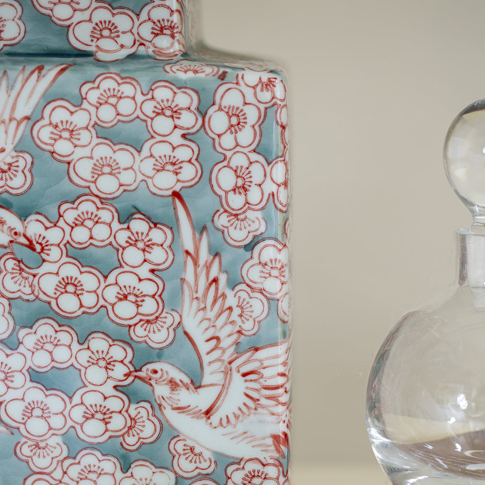 | Base Color | Muted turquoise with white flowers and red – outlined details, white birds with red accents |