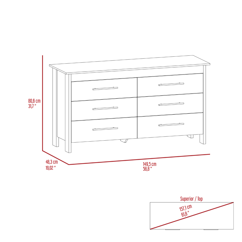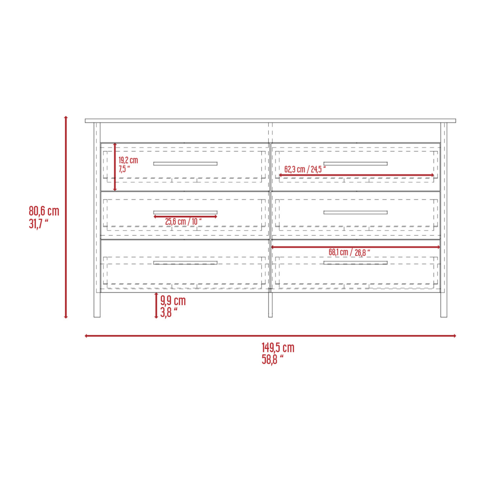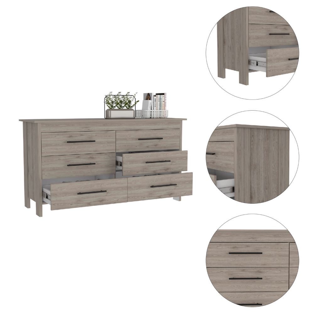 This six-drawer double dresser is a contemporary addition to any bedroom. It offers ample storage space for various items and a surface for decorative pieces. With its modern design, it brings a touch of elegance and functionality to your living space.