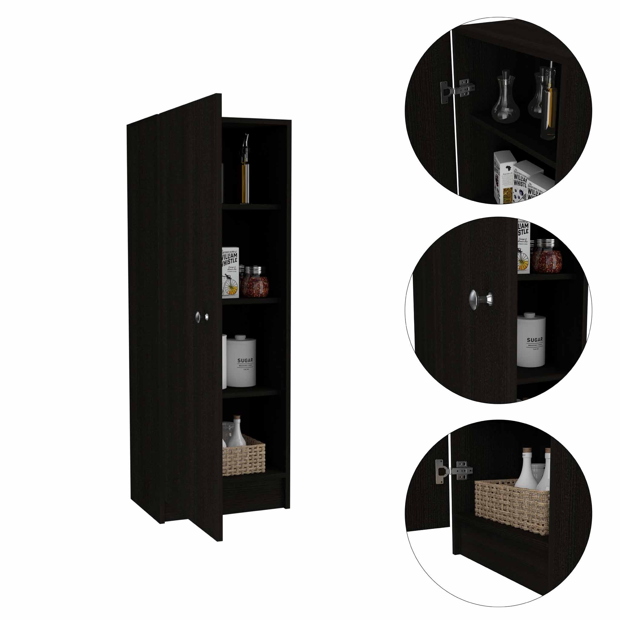 This modern single door pantry cabinet is a practical addition to any kitchen. It helps free up valuable countertop and cabinet space, making your kitchen more organized and your daily life more convenient.