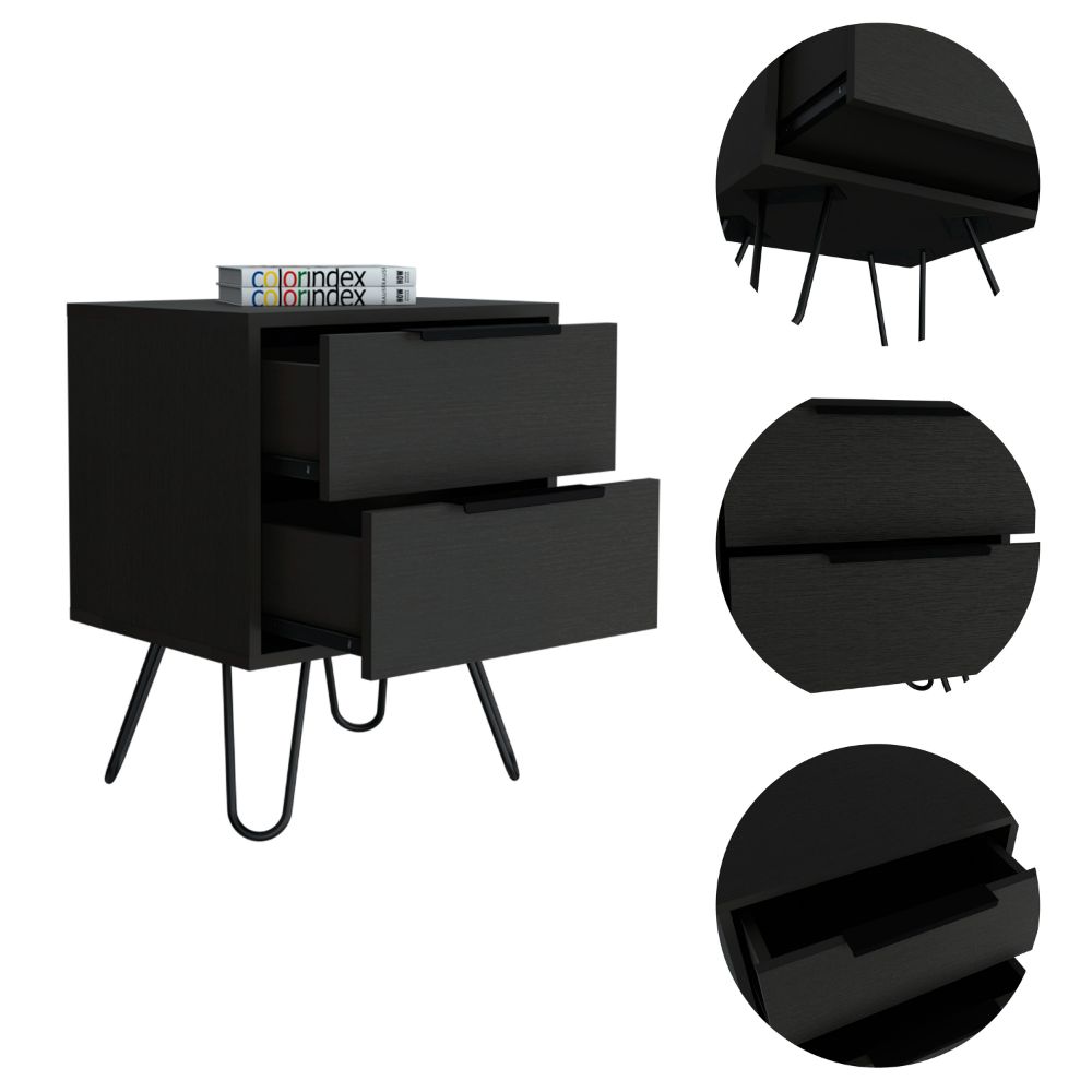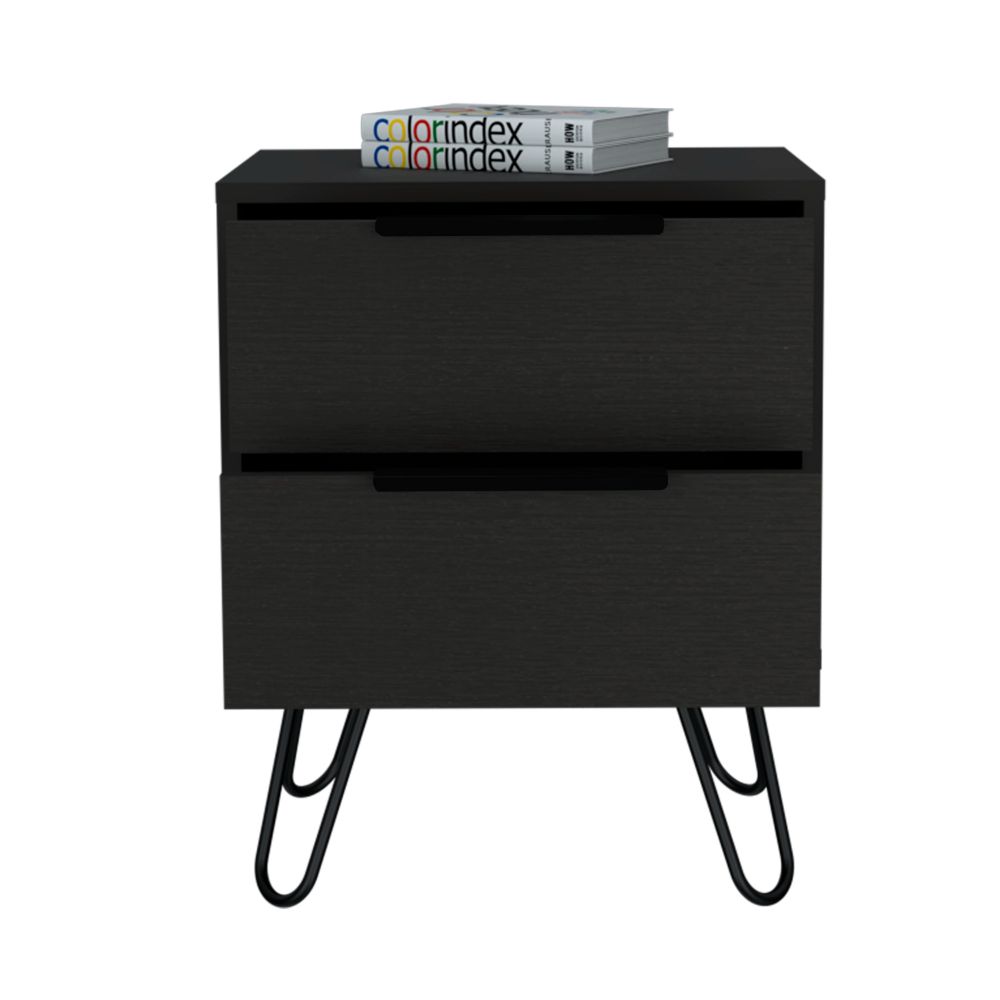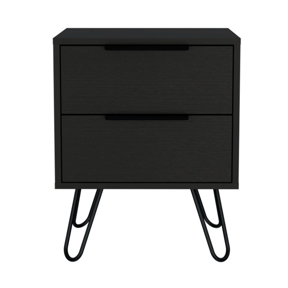 This modern nightstand is a stylish addition to any bedroom. It offers convenient storage with two drawers, helping you keep your items organized and within reach.