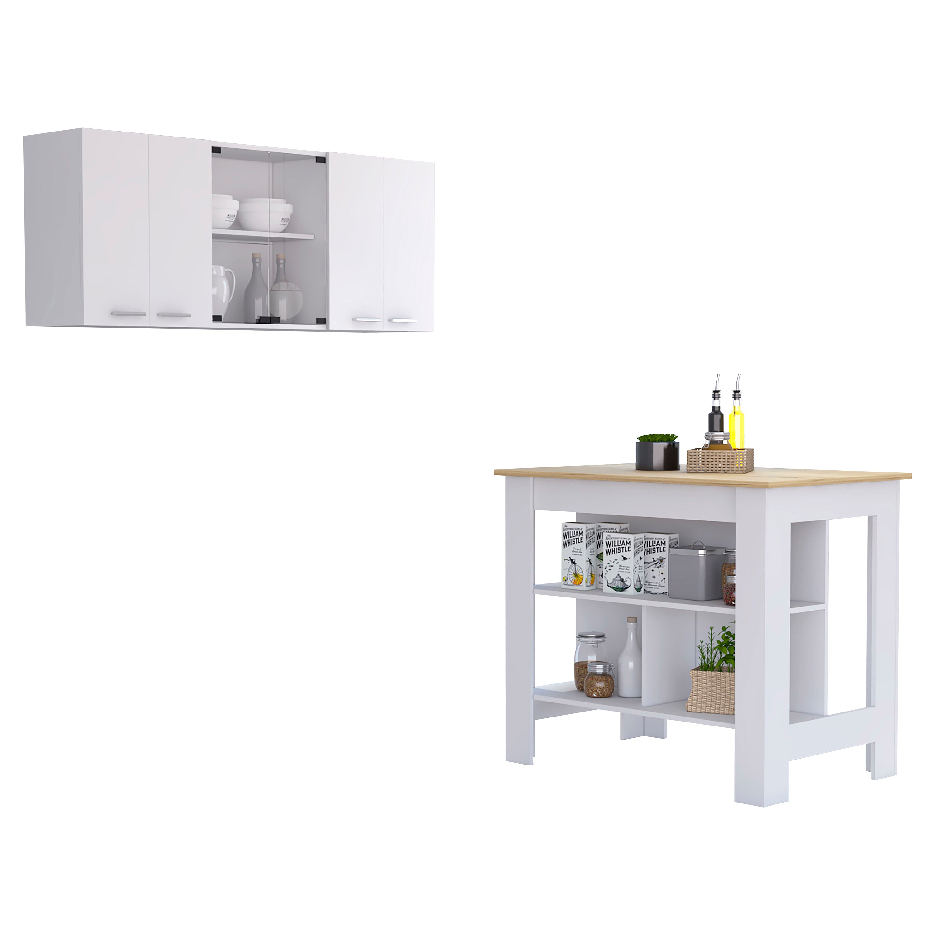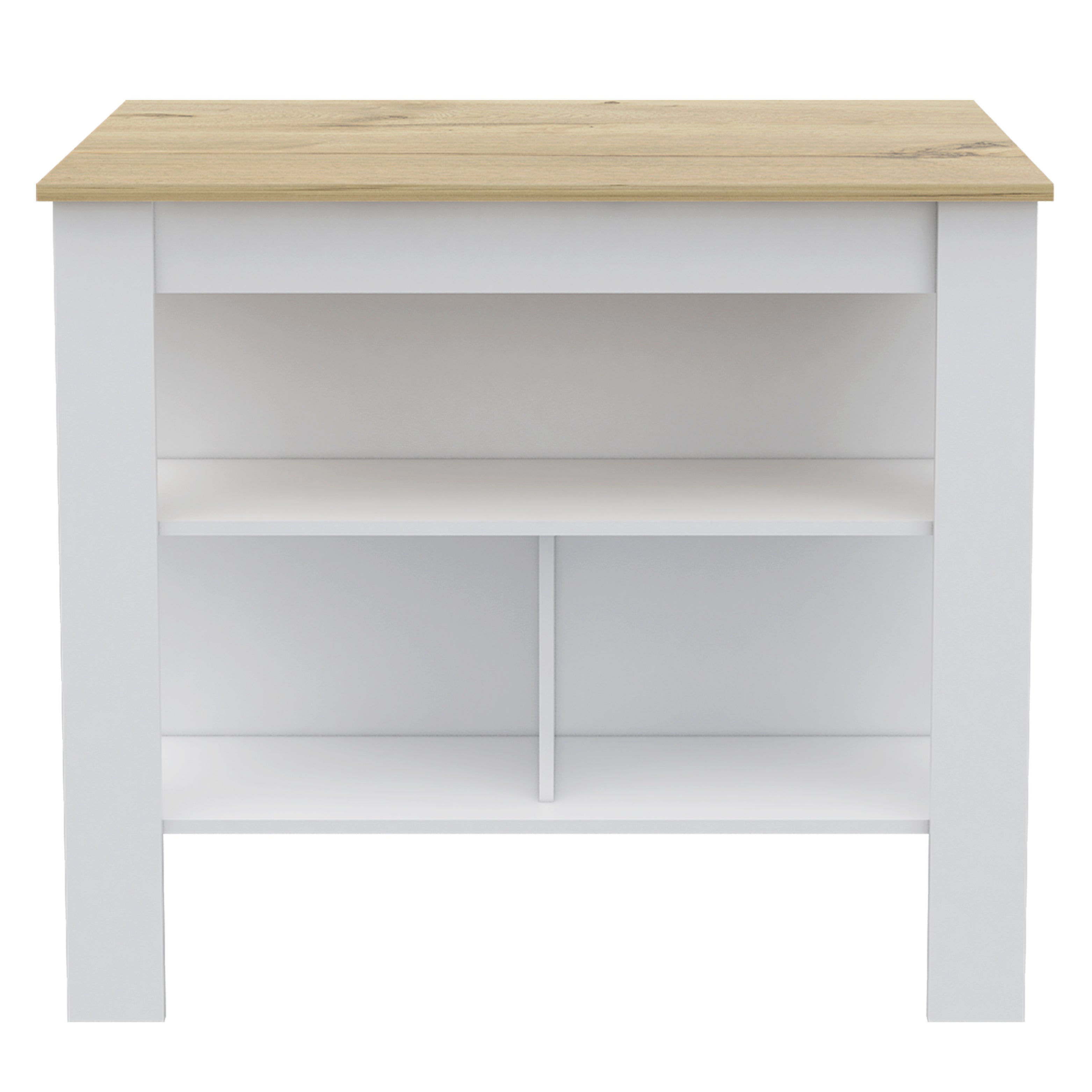 - Kitchen Island Design: Rectangular shape with vertical white frame, open shelving, and a light wood countertop