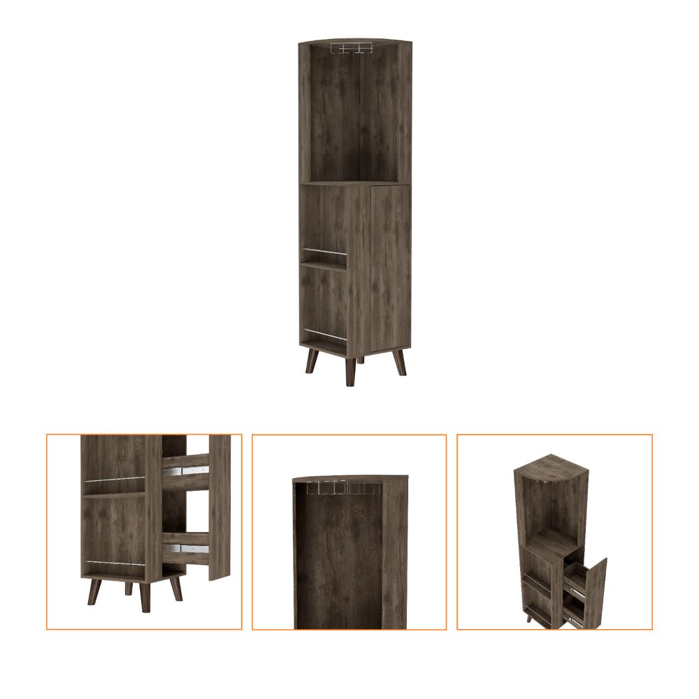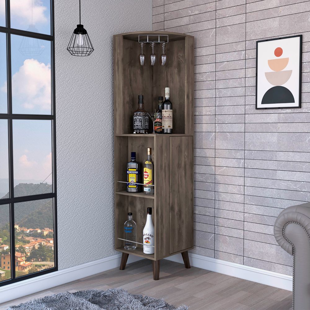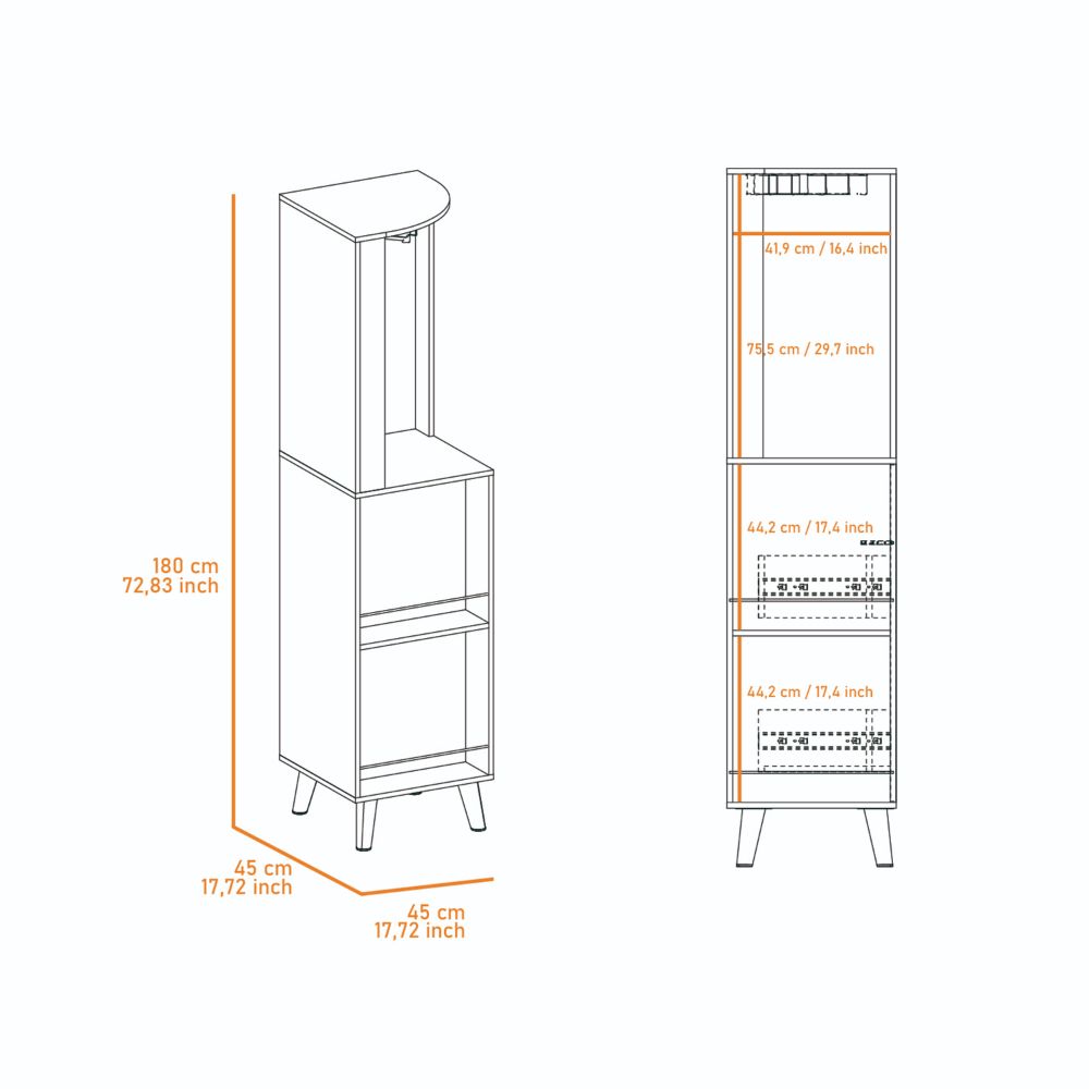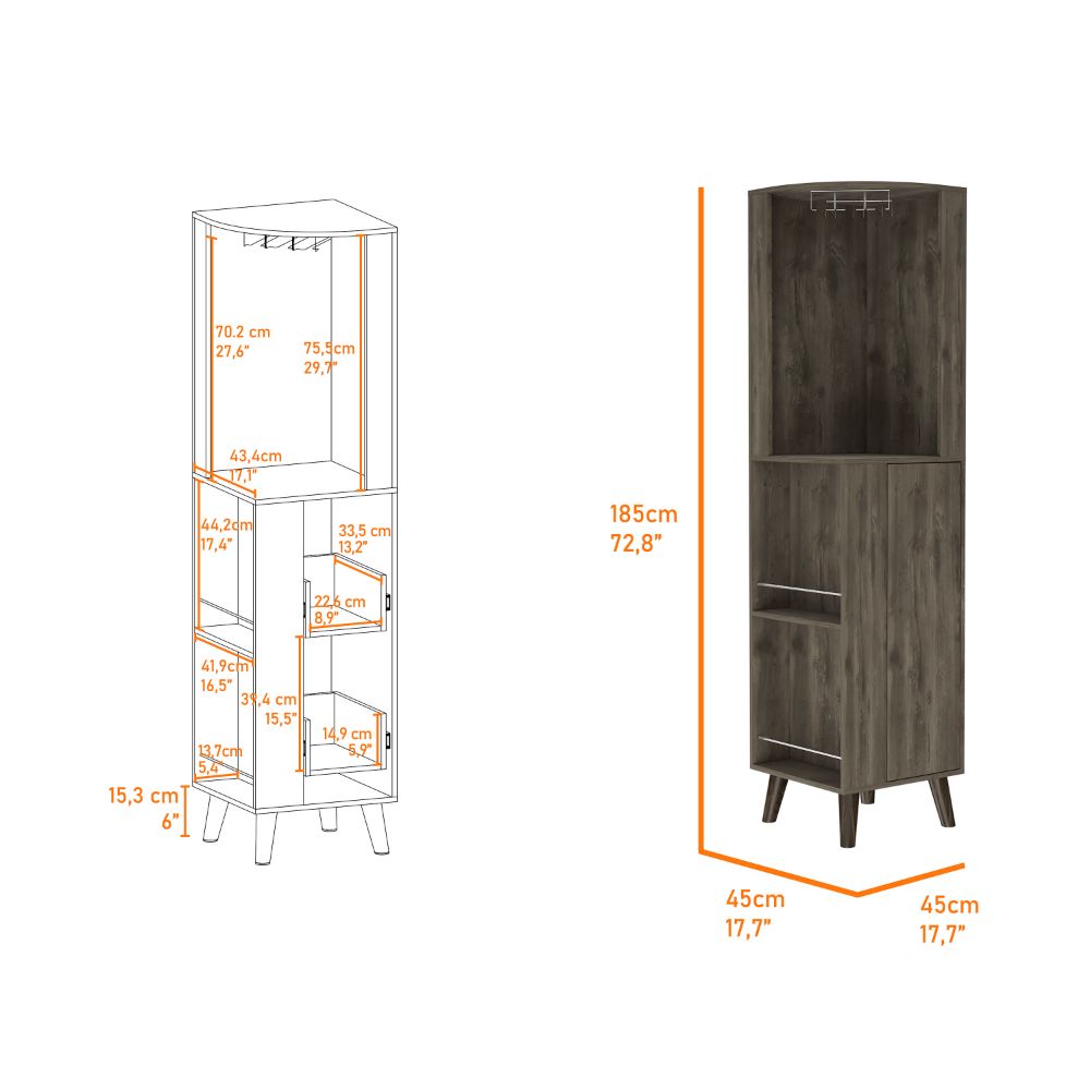 - Top Section: A curved, open compartment with a metal rack for hanging glasses