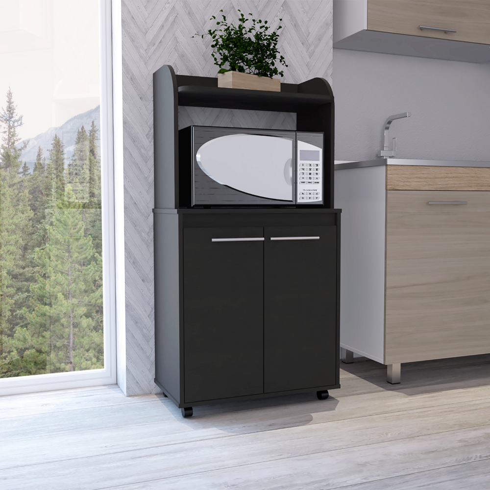 This mobile kitchen storage unit offers a perfect blend of style and functionality. It provides convenient storage solutions and mobility, making it a great addition to any modern kitchen. The dedicated microwave shelf ensures easy access to your appliance.