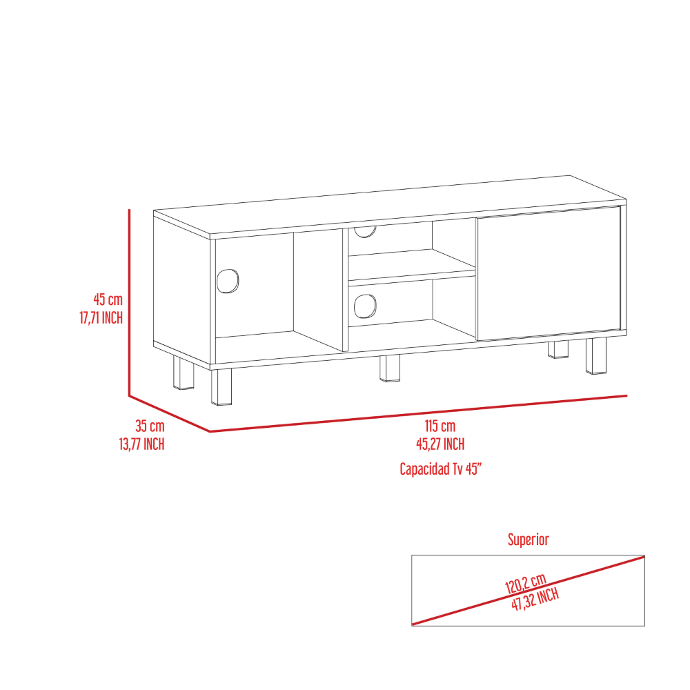 - Cable Management: Circular cutouts in the middle shelving area for ventilation and wire passage