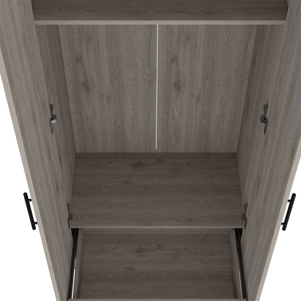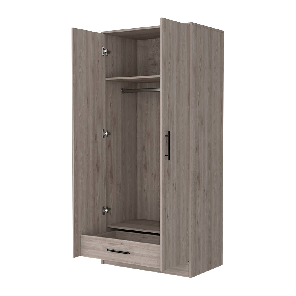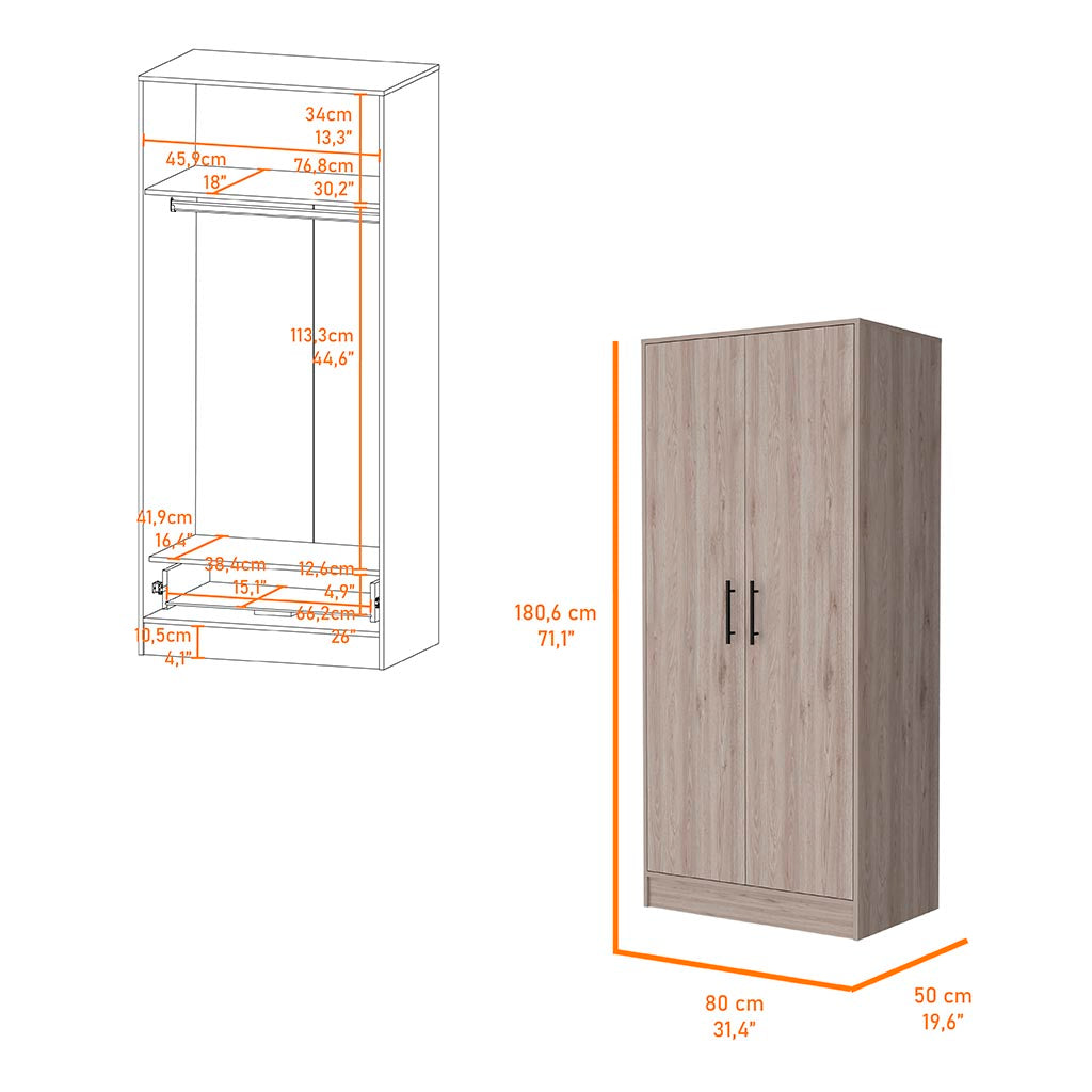 - Interior Storage: Includes a metal hanging rod, a top shelf, a lower shelf, and a bottom drawer