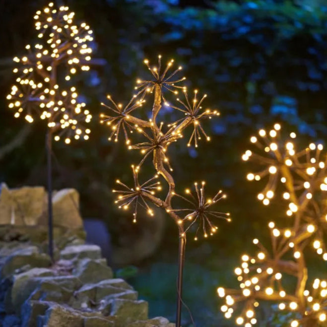 These outdoor decorative light stakes are a wonderful addition to any outdoor space. They feature wireframe structures with clusters of small lights, creating a twinkling and inviting effect. They are designed to be easily placed in the ground to enhance the nighttime aesthetic of your garden or pathway.