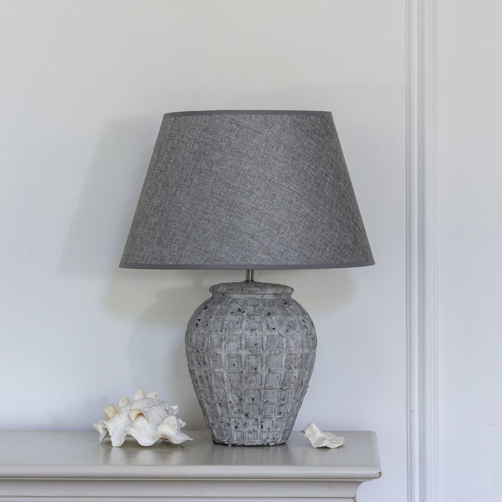 | Lampshade Material | Fabric (linen or linen – blend) with a gray trim |