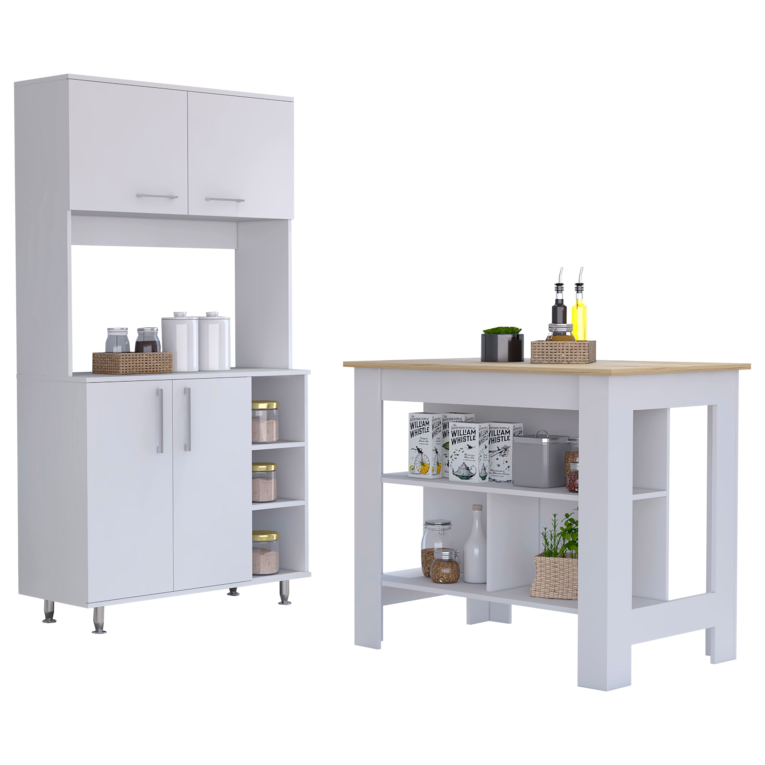 - Storage: Spacious lower shelves on the kitchen island and multiple storage compartments in the pantry cabinet
