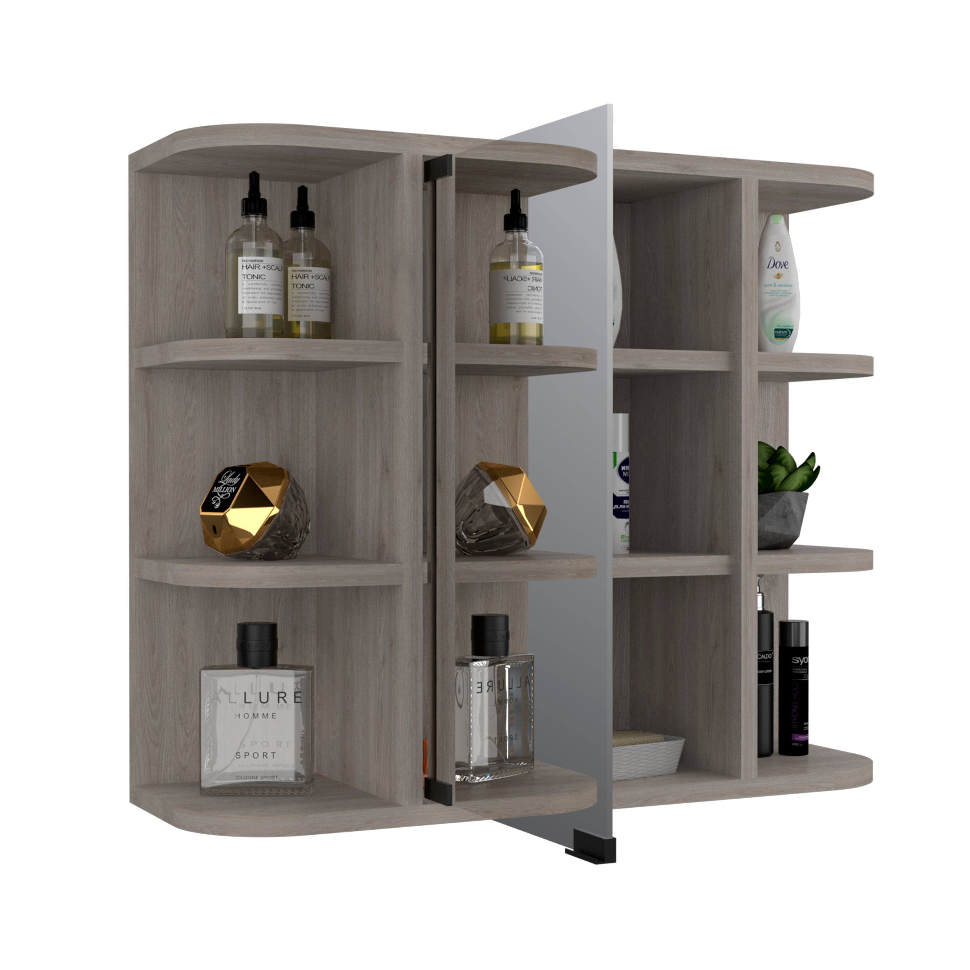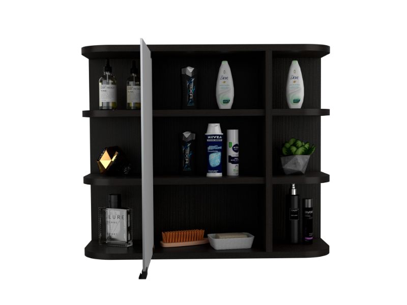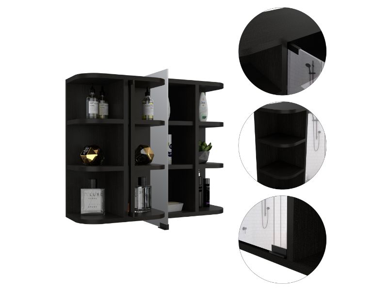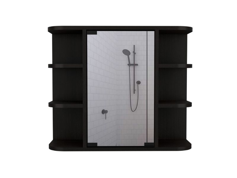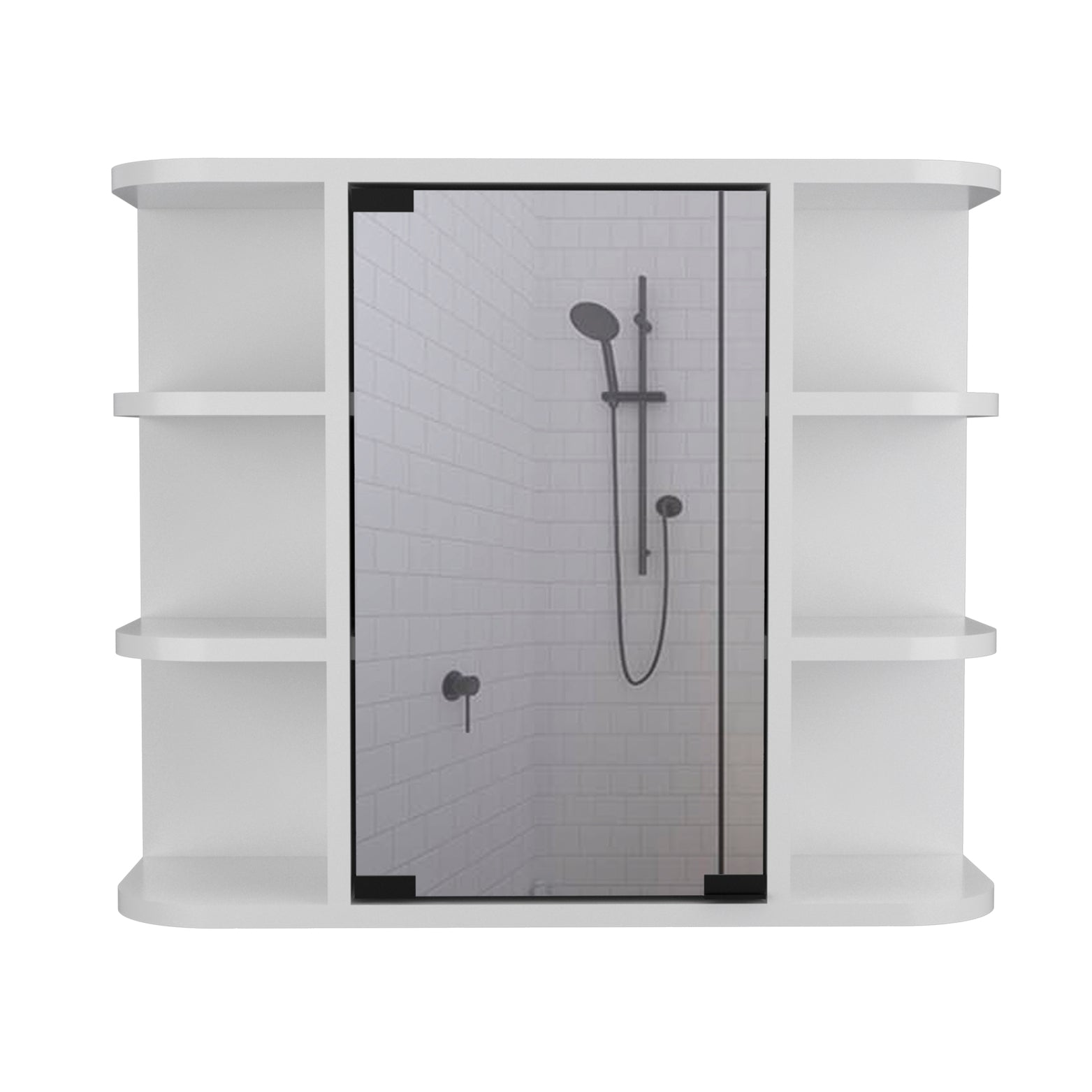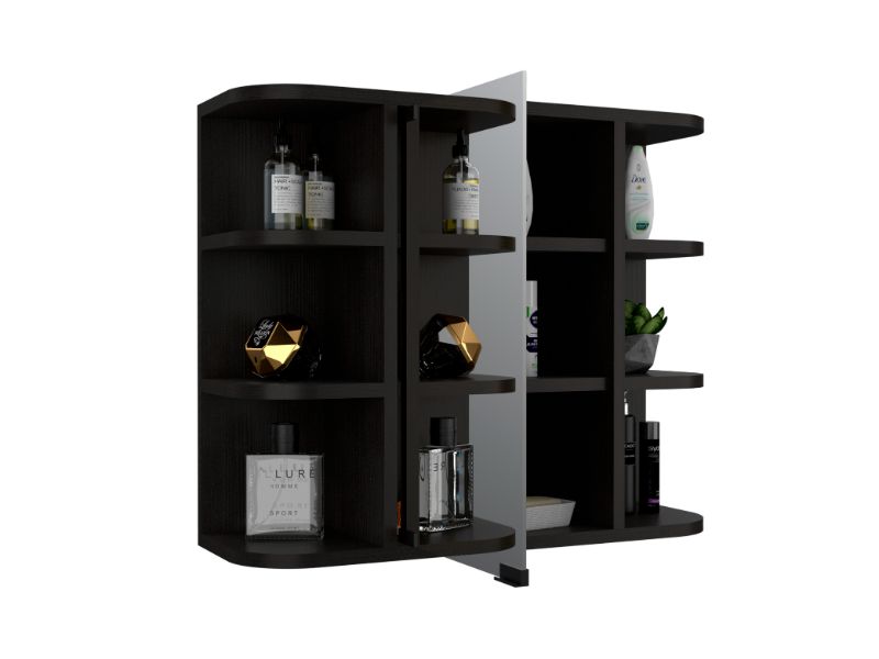 - Design: Rectangular with curved edges, two side sections with open shelves and a central glass – paneled door
