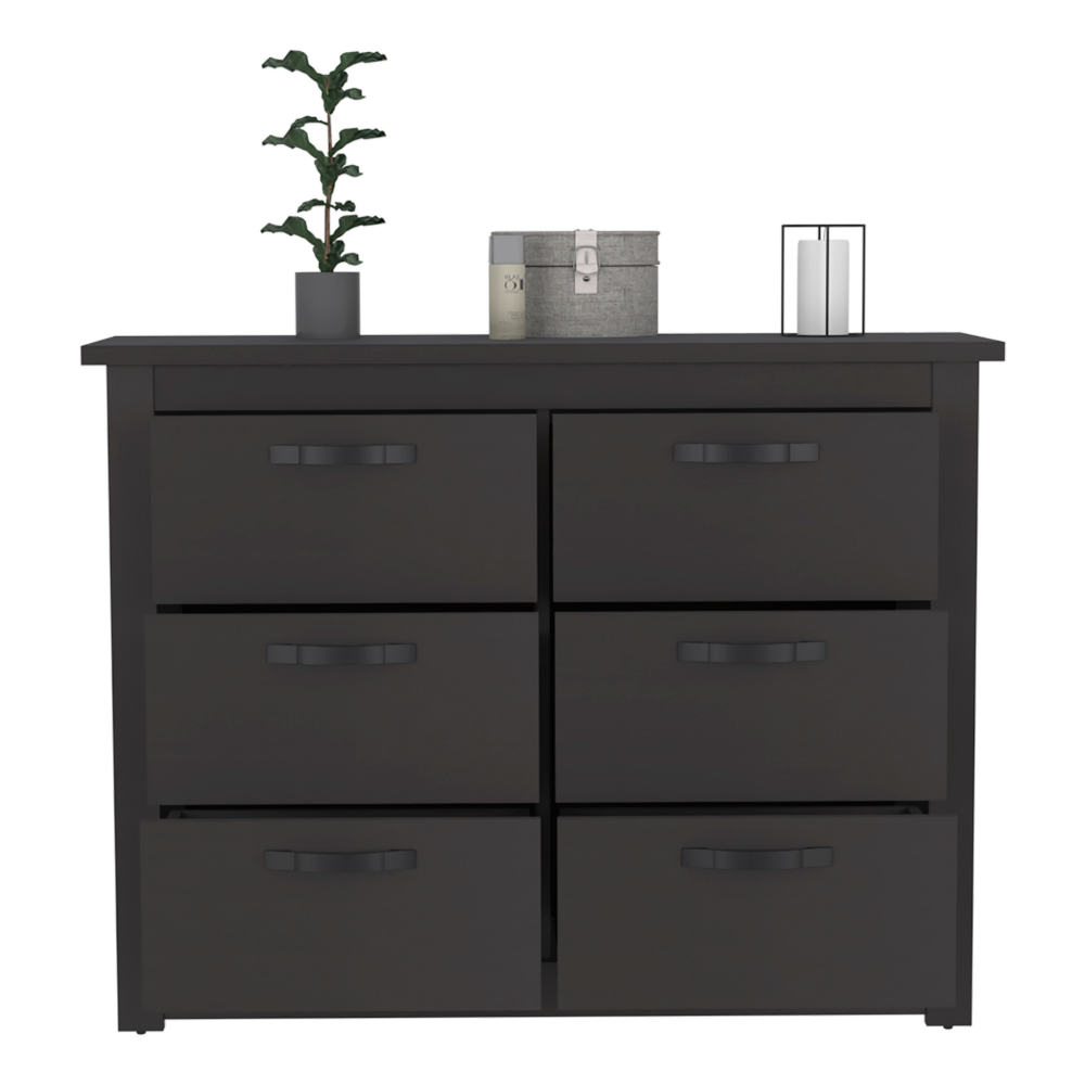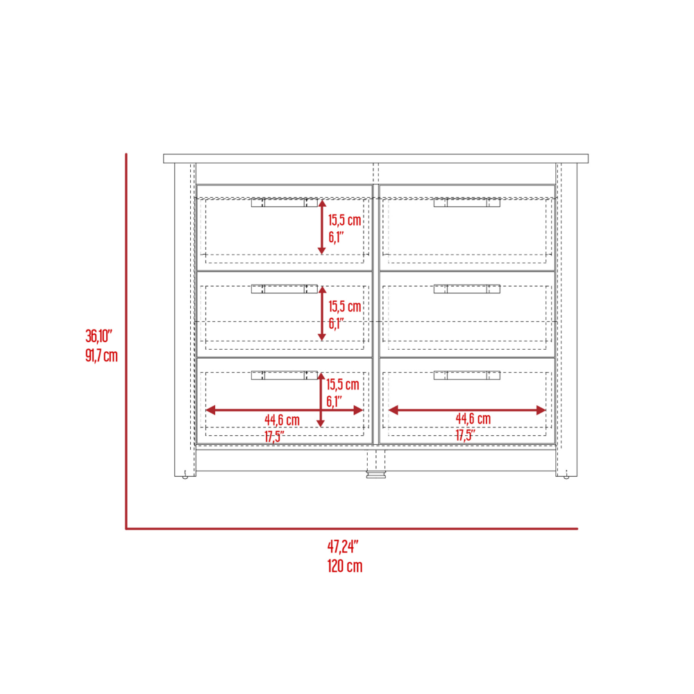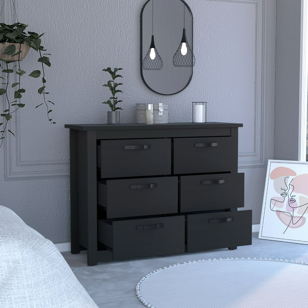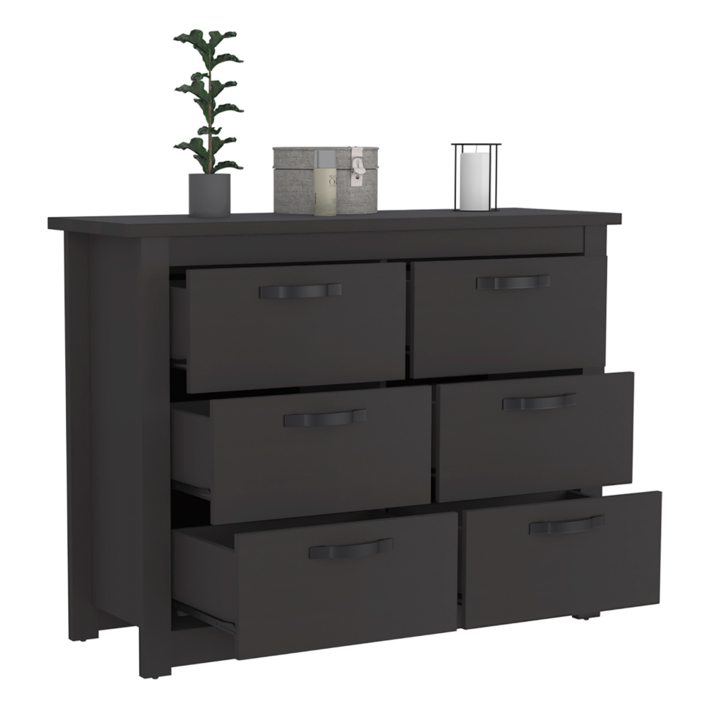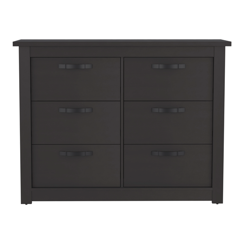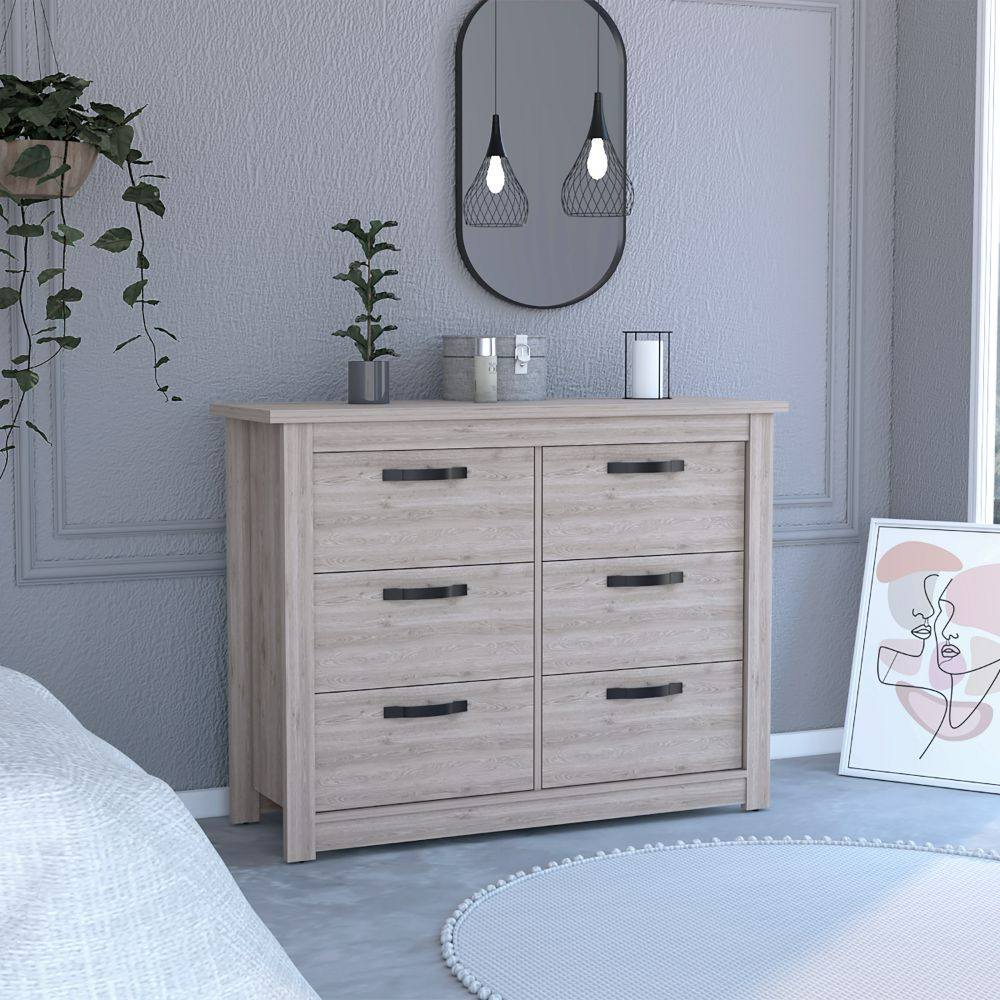 This contemporary dresser offers both style and functionality. It provides ample storage space with its six drawers and a superior top for displaying decor, helping you keep your belongings organized.