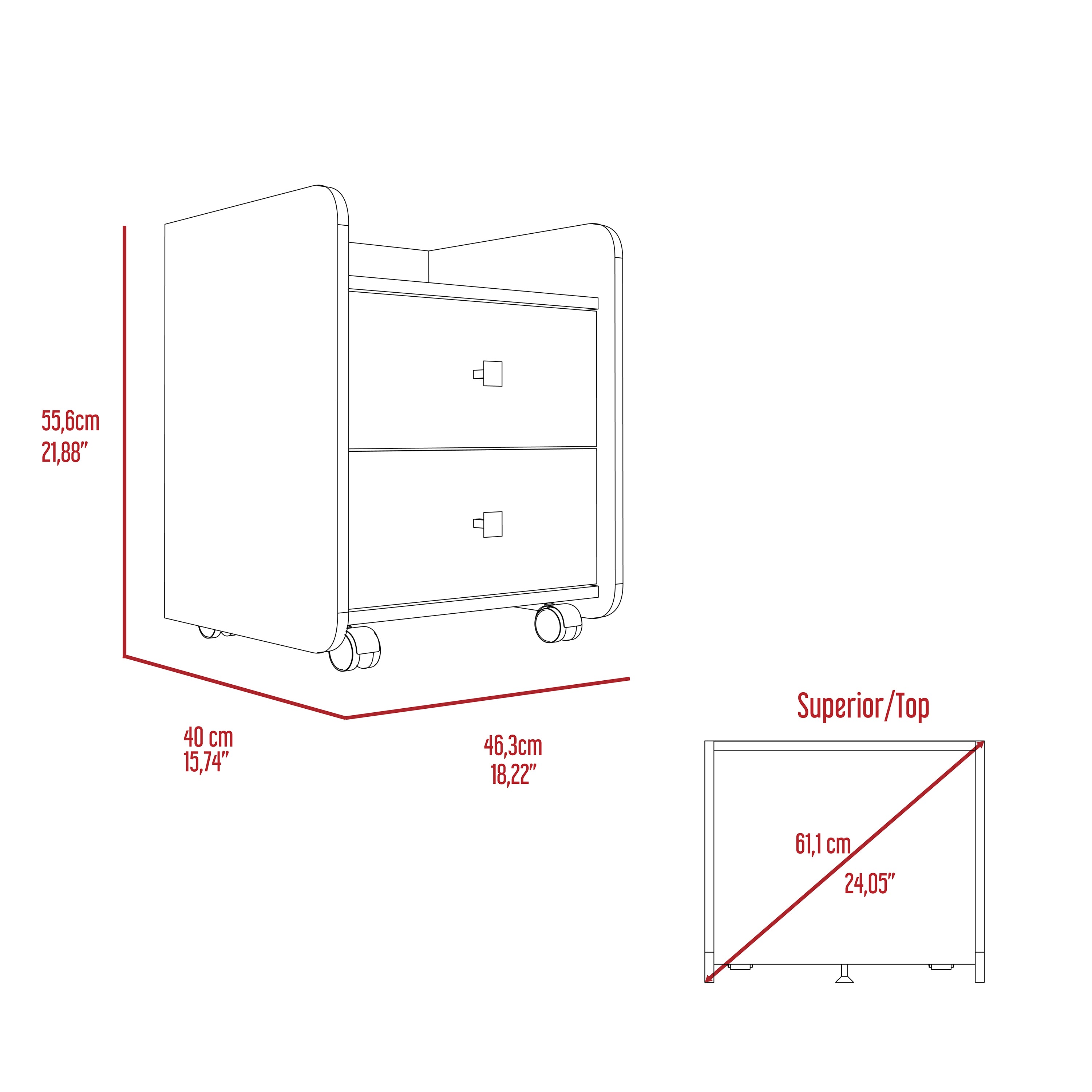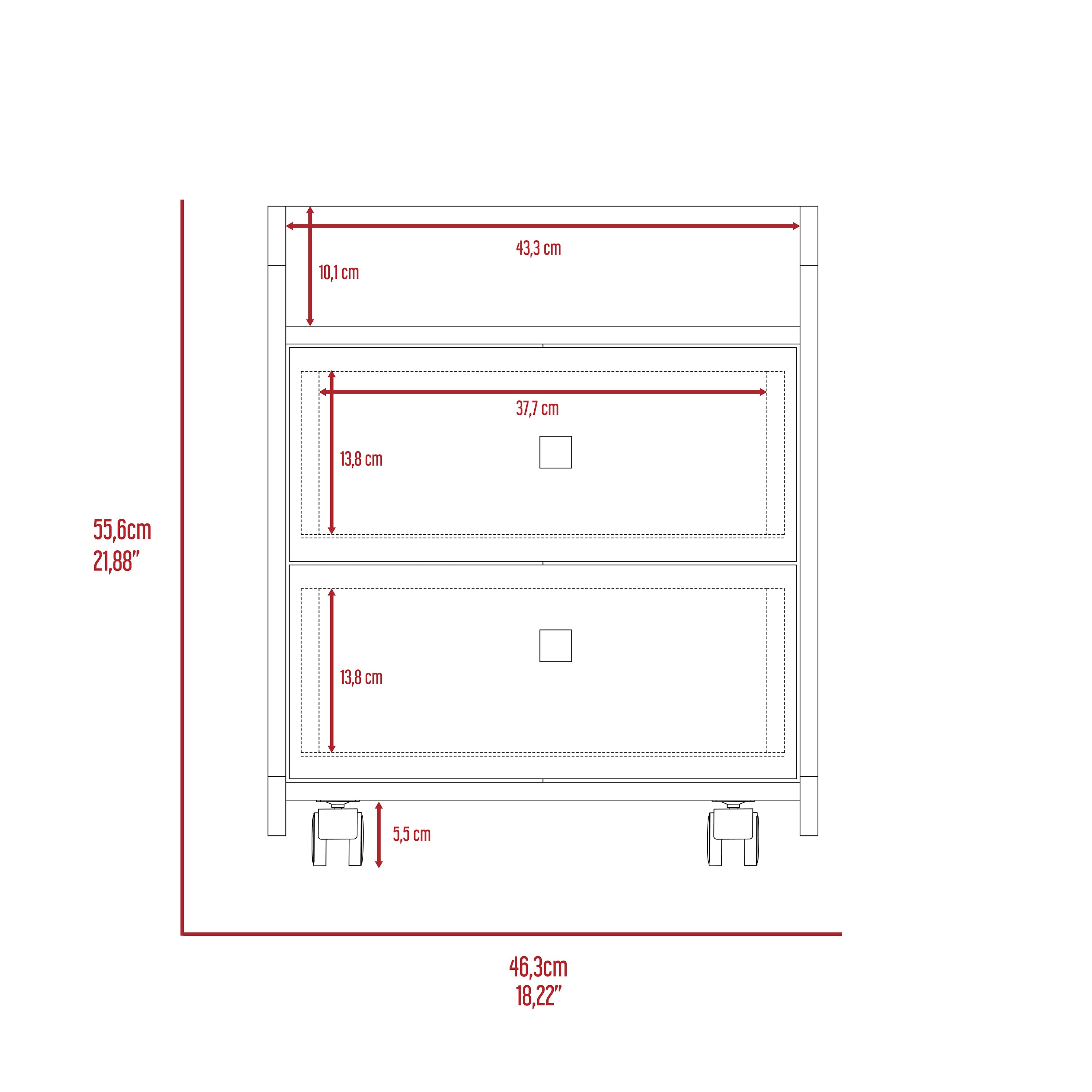 - Drawers: Two stacked drawers with square white pulls for easy access